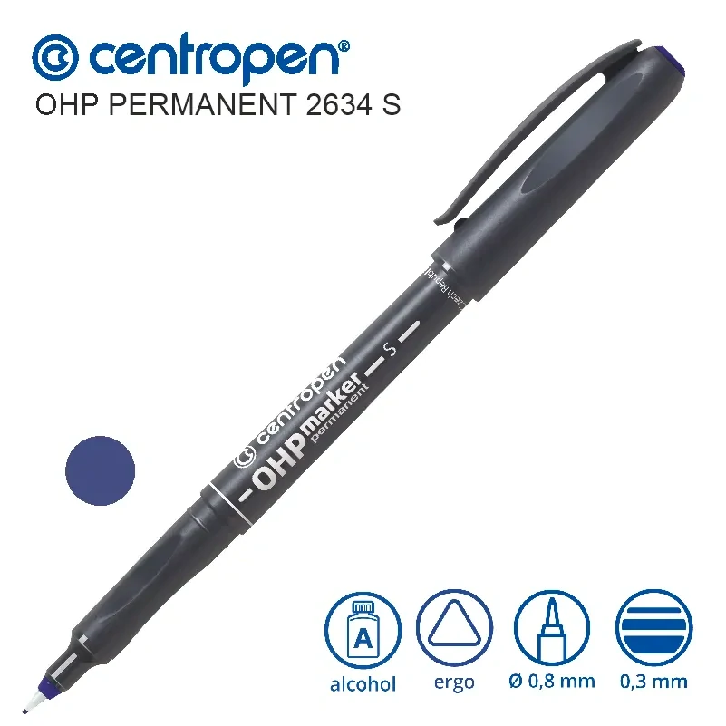 Permanentní popisovač Centropen OHP 2634 S – modrý, tenký hrot 0,3