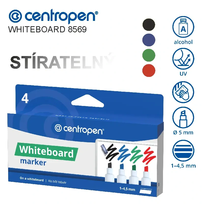 Stíratelná sada popisovačů Centropen Whiteboard 8569 – 4 barvy, zkosený hrot 1-4,5 mm97 Kč/ ks80 Kč bez DPH