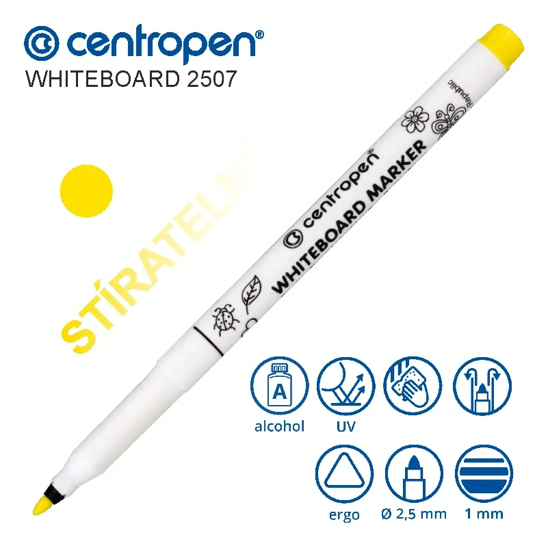 Stíratelný popisovač Centropen Whiteboard 2507 – žlutý, slabý hrot 1 mm15 Kč/ ks13 Kč bez DPH